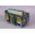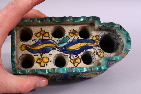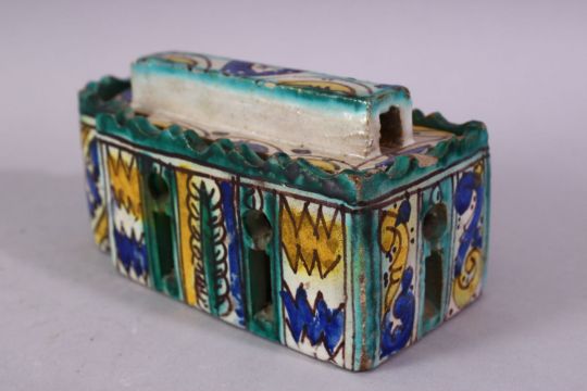 A PERSIAN PAINTED POTTERY INKSTAND AND COVER, the interior with six pen holders and an inkwell, 16cm long.
