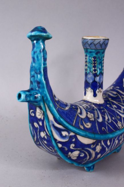 A 19TH / 20TH CENTURY IZNIK POTTERY UNUSUAL HOLY WATER FLASK, with a blue ground and white motif decoration, 22cm wide x 10cm.