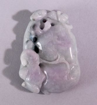 A CHINESE CARVED AND PIERCED JADITE / HARDSTONE AMULET, in the form of a guord and animal, 5cm x 3.5cm.