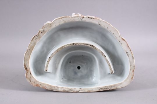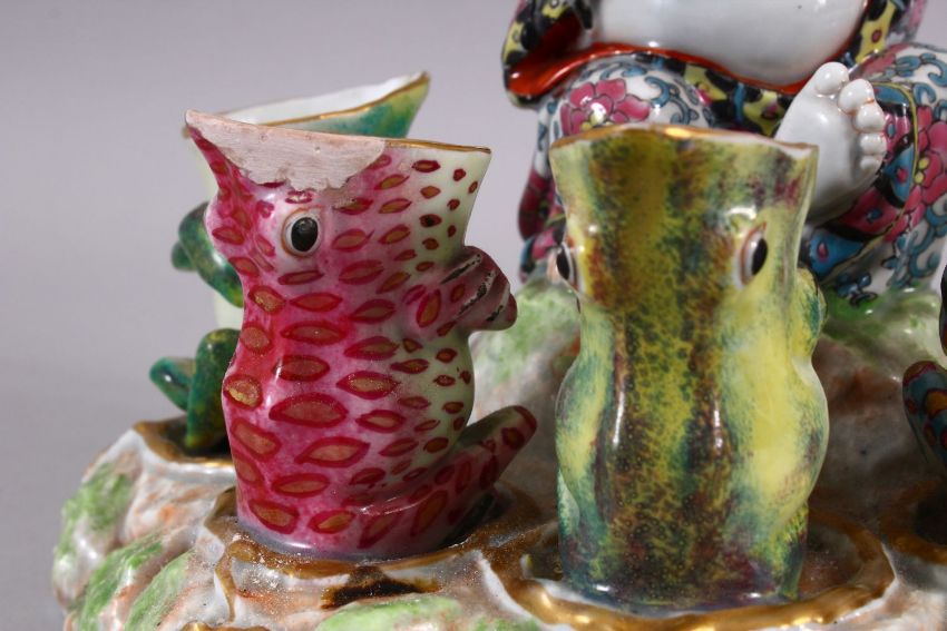 A CHINESE REPUBLIC STYLE PORCELAIN FLOWER / EGG HOLDER OF BUDDHA AND FROGS, the frogs seated with their mouths open, Buddha stood holding a frog, 27cm high x 26cm