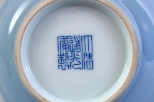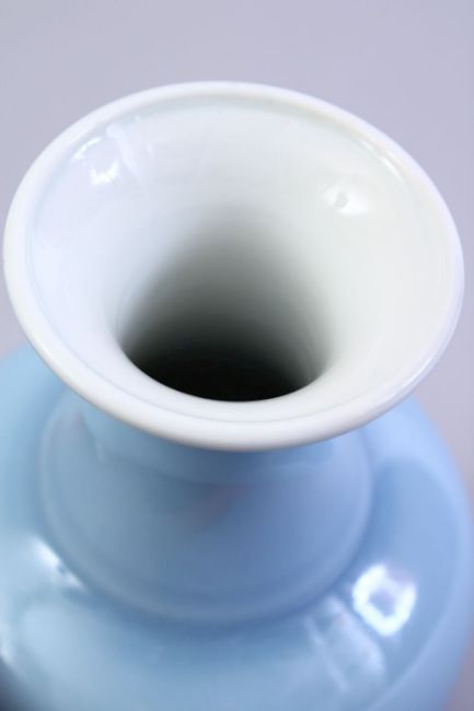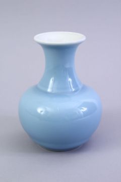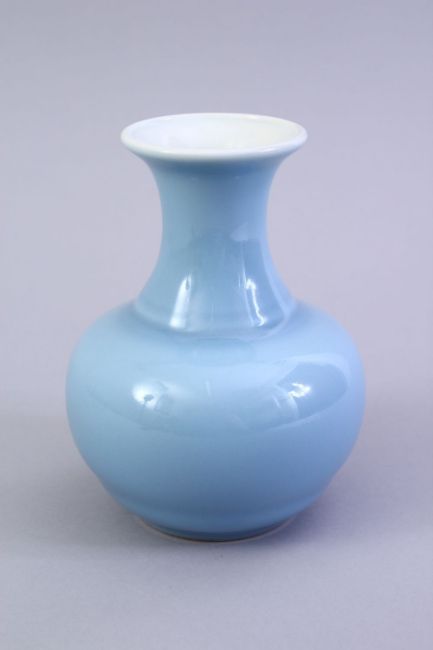 A GOOD DAOGUANG STYLE CHINESE SKY BLUE GLAZED PORCELAIN VASE, with a ribbed lower section and shoulder, the base with a six character daoguang mark. Private U.K collection. 15cm high.