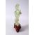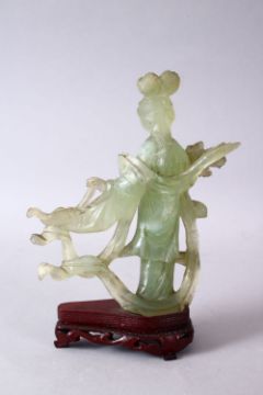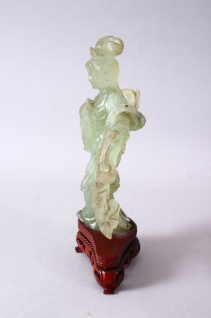 A 19TH / 20TH CENTURY CHINESE CARVED JADE FIGURE OF GUANYIN, upon a carved wooden base, 16cm x 11cm