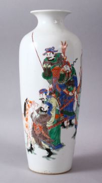 A 19TH/20TH CENTURY CHINESE FAMILLE VERTE PORCELAIN VASE, decorated with scenes of warriors and a horse upon a monochrome white ground, 29.5cm high.