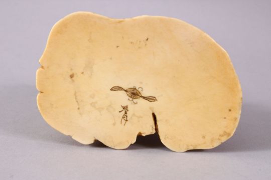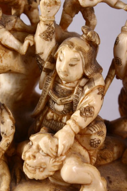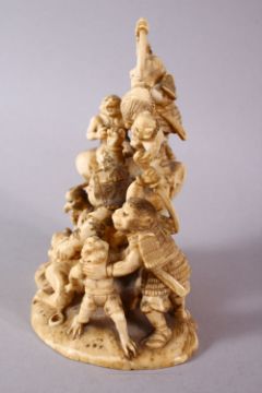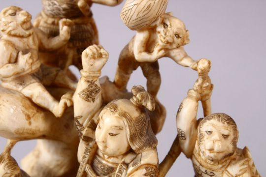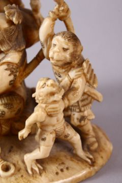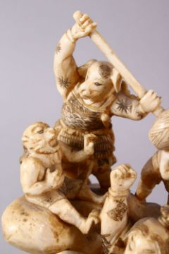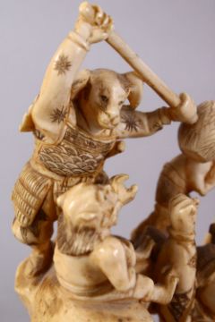 A JAPANESE MEIJI PERIOD CARVED IVORY OKIMONO GROUP - depicting figures attacking oni demons, one dog dressed as a warrior and a tengu, the base with an incised signature, 12cm high x 9cm wide.