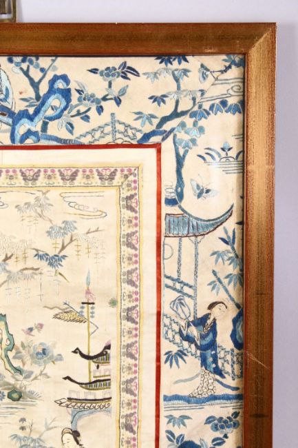A 19TH CENTURY CHINESE EMBROIDERED PICTURE OF FIGURES IN LANDSCAPES AND NATIVE FLORA, Framed 17cm x 38cm