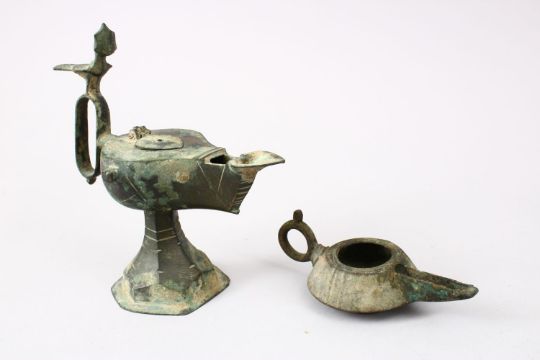 A COLLECTION OF FOUR INDIAN & PERSIAN OIL LAMPS AND A 12TH CENTURY INKWELL (4)