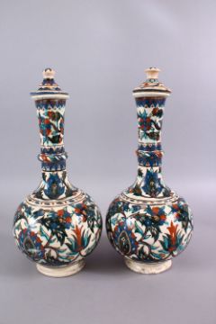 A LARGE PAIR OF 19TH CENTURY OTTOMAN TURKISH KUTAHIYA LIDDED PORCELAIN BOTTLE VASES,each with floral motif decoration, both with covers, 38cm.