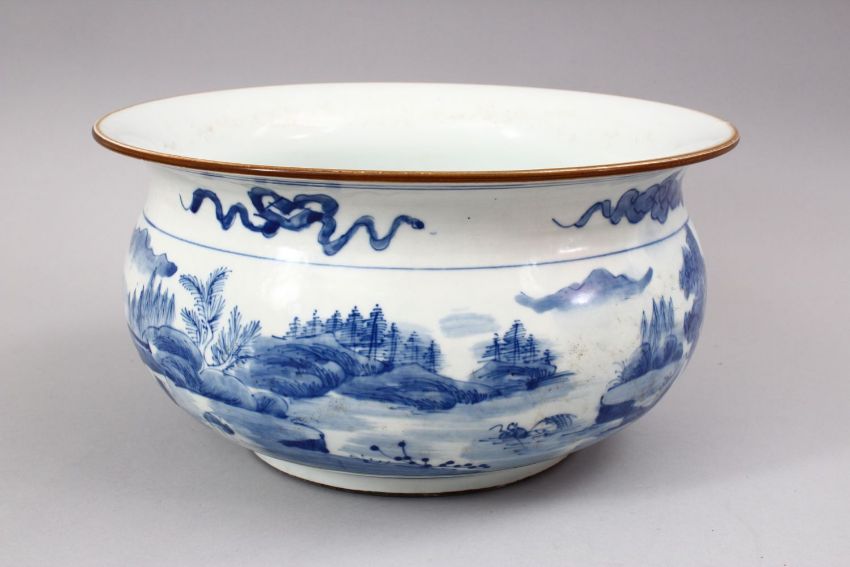 A LARGE CHINESE BLUE & WHITE PORCELAIN BOWL, decorated with precious objects and landscape views, 26cm diameter.