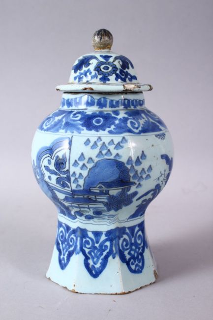 A CHINESE BLUE & WHITE OCTAGONAL FORMED JAR & COVER, the jar decorated with scenes of figures in landscapes, with a hanging formal motif border, 20cm high.