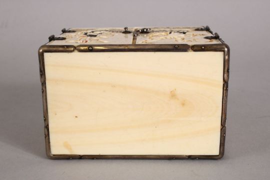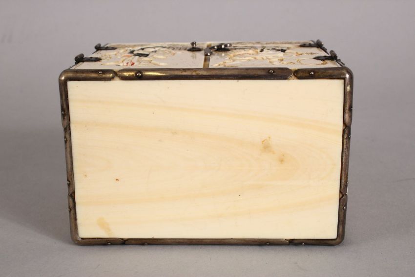 A GOOD JAPANESE MEIJI PERIOD CARVED IVORY KODANSU, the cabinet carved to each side with scenes of figures in landscapes, with silver bamboo style mounts, opening to reveal a further carved interior and three drawers, 7.5cm high x 8.5cm wide.