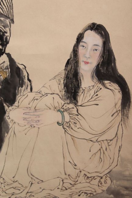 A GOOD CHINESE PAINTED SCROLL OF TWO LADIES, both seated in a landscape scene playing musical instrument, the lower section with a signature and seal mark,