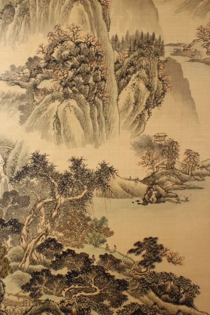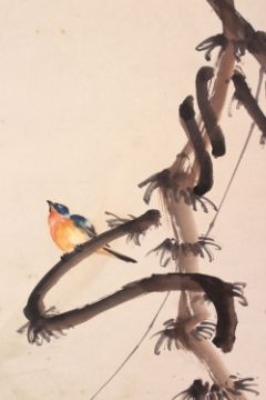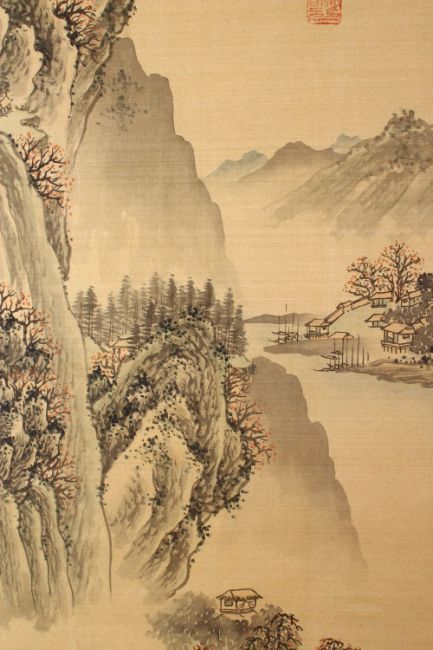 20TH CENTURY CHINESE SCHOOL, mountainous landscape with trees and buildings, signed, image 87cm x 44cm, together with a further painting of a bird perched on a branch, 90cm x 43cm.