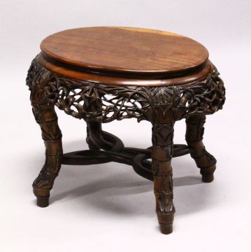 A LATE 19TH CENTURY CHINESE HARDWOOD OVAL TABLE, plain top, supported on pierced and carved frieze on similarly carved legs, united by an 'X' shaped stretcher, 70cm long, 54cm wide, 57cm high.