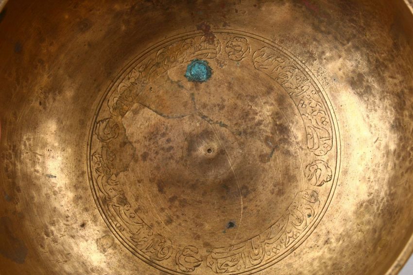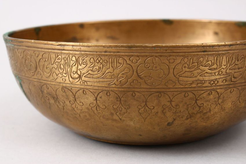 A PERSIAN ENGRAVED BRASS CALLIGRAPHIC BOWL, carved with calligraphy and animals, 18cm.