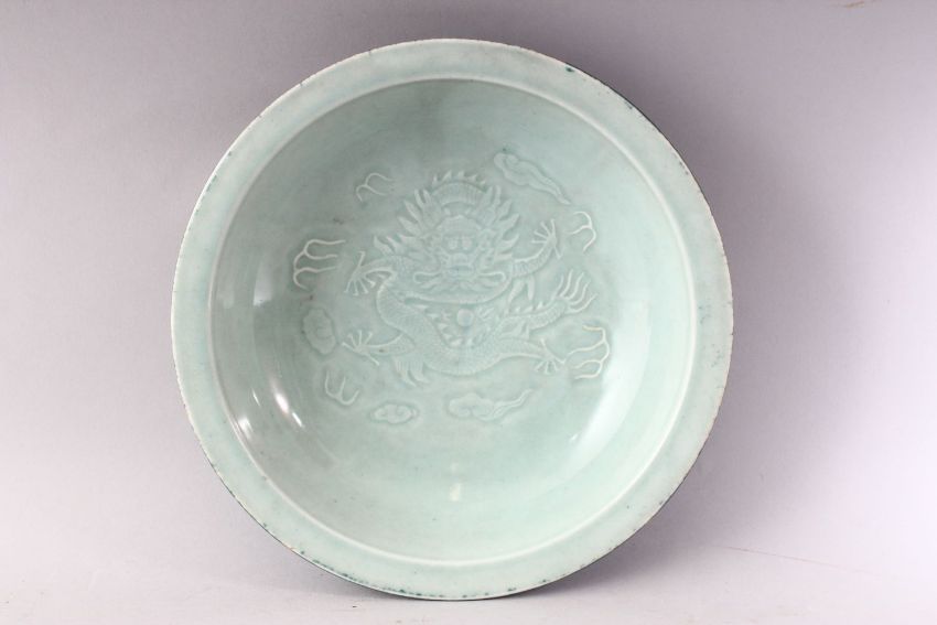 A 20TH CENTURY CHINESE CELEDON CIRCULAR DISH, the centre with moulded dragon decoration, green ground exterior, with a six character mark to base, 28cm diameter.