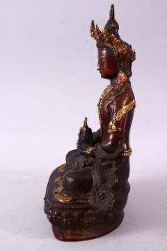 A CHINESE GILT BRONZE INLAID FIGURE OF A DEITY / BUDDHA, in a seated position with an object in hand, upon lotus base, with inlaid semi precious style stones, 30cm high x 21cm wide