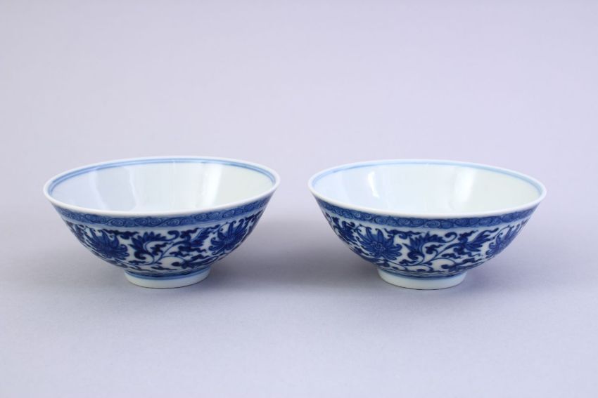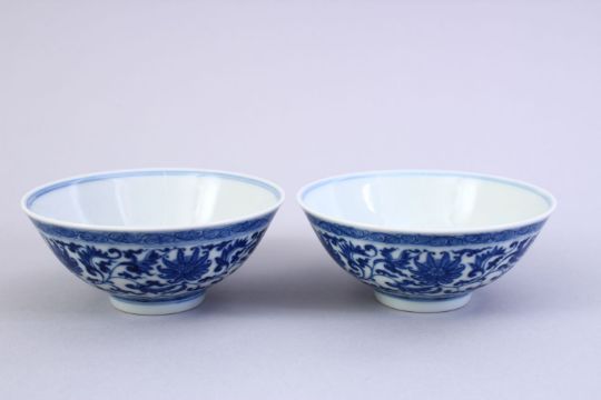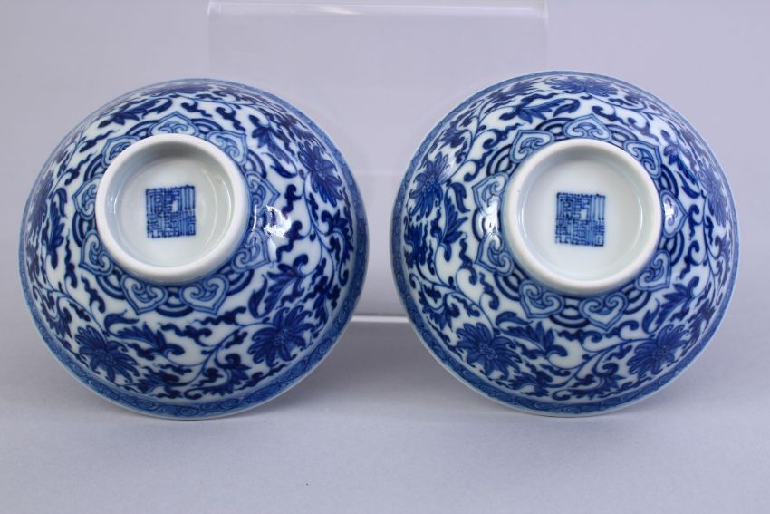 A FINE PAIR OF CHINESE MING STYLE BLUE & WHITE PORCELAIN CUPS, the cups decorated with a central interior roundel of lotus, the exterior decorated with formal scrolling lotus between bands of ruyi and scroll borders, the bases with six character Qianlong markS, 9.8cm diameter. Private U.K collection.