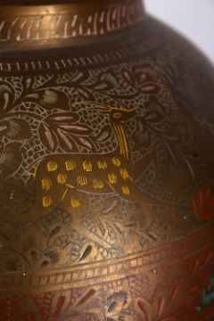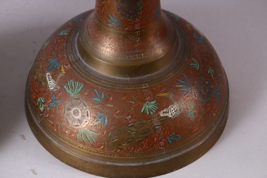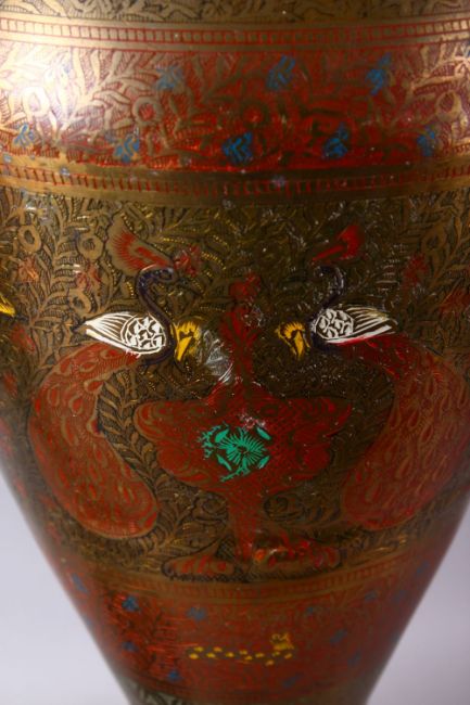 A LARGE PAIR OF 19TH/20TH CENTURY INDIAN BRASS FLOOR STANDING VASES, each with carved decoration depicting native birds, butterflies and other animals, with polychrome decoration, 91cm high.