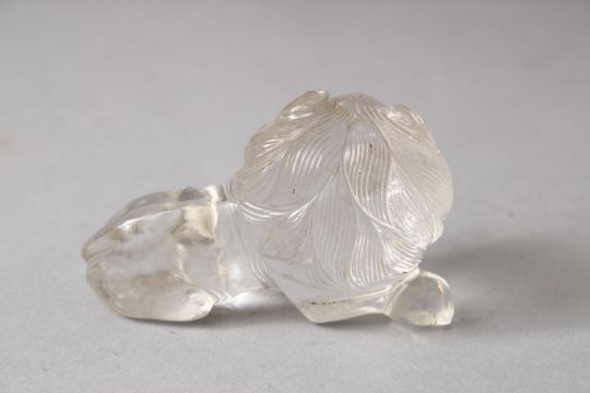 A GOOD ISLAMIC / PERSIAN CARVED ROCK CRYSTAL LION, 7cm.