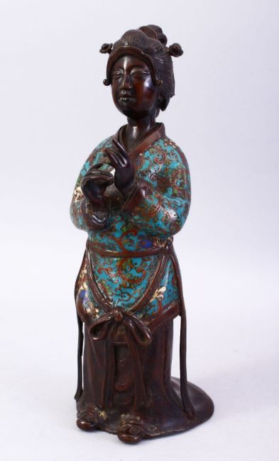 A 19TH CENTURY OR EARLIER CHINESE BRONZE & CLOISONNE FIGURE OF A WOMAN, The robes detailed in cloisonne work, the base with a filled residue, 33cm,