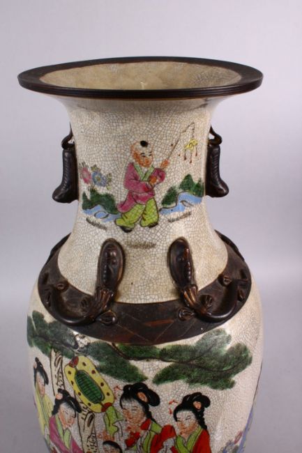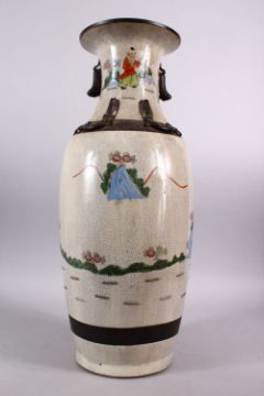 A LARGE CHINESE 19TH / 20TH CENTURY FAMILLE ROSE CRACKLEWARE PORCELAIN VASE, decorated with scenes of figures and beasts in landscapes, with stonework decoration and borders, twin lion handles, and moulded chilong, 58.5cm high.