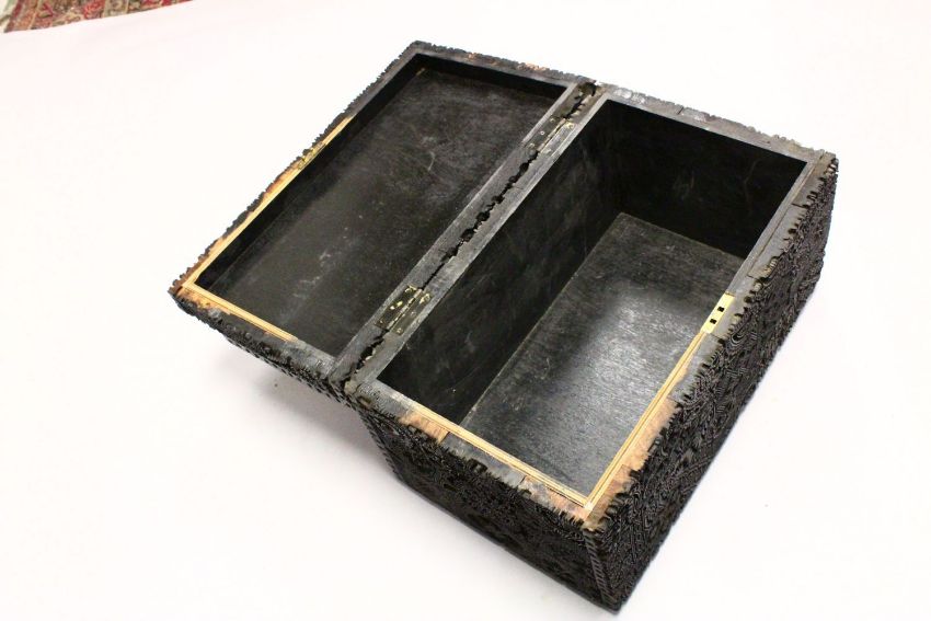 A HIGHLY UNUSUAL RECTANGULAR HINGED BOX, constructed from numerous carved hardwood printing blocks, 66cm long, 40cm deep, 37cm high.