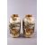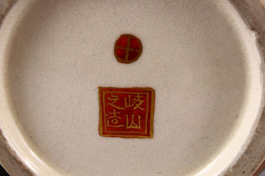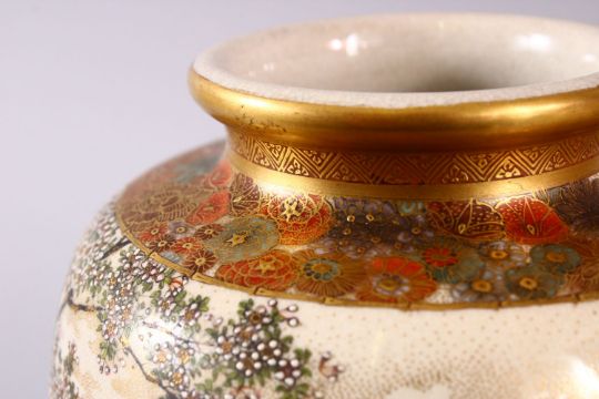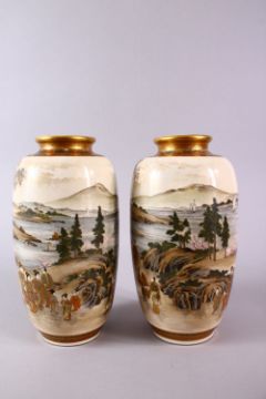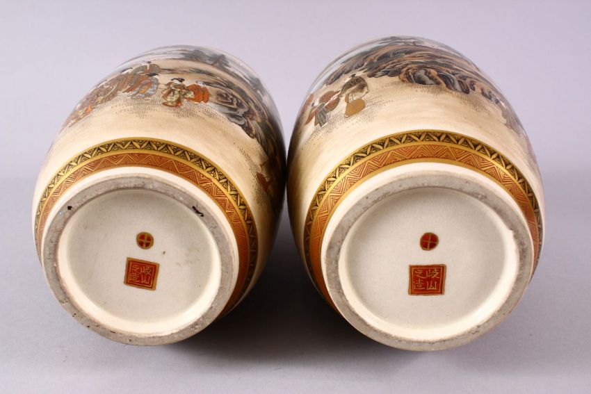 A LARGE AND FINE PAIR OF JAPANESE MEIJI PERIOD SATSUMA POTTERY VASES BY KIZAN - the large pair finely decorated with scenes of geisha girls, and male figure in traditional robes, stood aside a waterside native landscape, with raised enamel cherry blossom trees, with floral decorated and gilded border decoration, the base with artist seal signature for "Kizan" and clan mon, 25cm high.