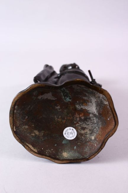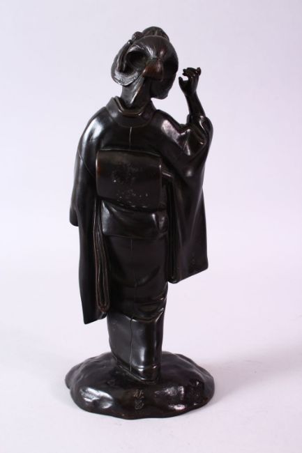 A 19TH CENTURY JAPANESE BRONZE FIGURE OF A GEISHA, with arm raised, 27cm high.