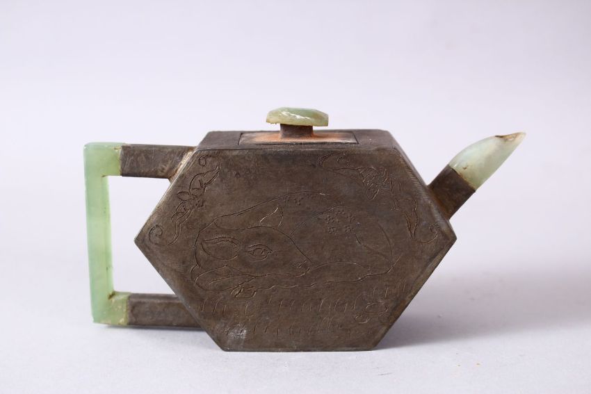 A CHINESE METAL & JADE TEAPOT, the teapot body formed from white metal and carved with scenes of shou lao and deer, with a jade handle, finial and spout, the underside with a seal mark, 8cm high x 14cm wide.