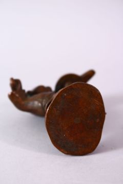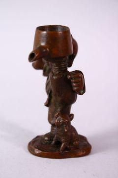 A JAPANESE BRONZE FIGURE OF A BOY & PIG, the boy holding an oil vessel aloft, signed underside, 8cm.