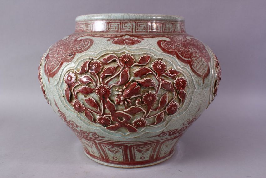 A LARGE CHINESE MING STYLE COPPER RED CARVED PORCELAIN VASE, with carved flroal panels and border decoration in copper red, 28cm x 38cm.