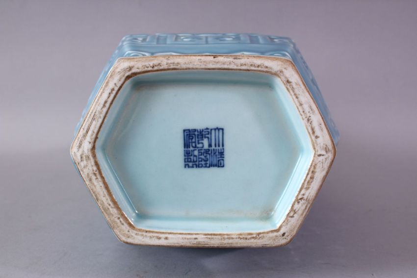 A CHINESE ROBINS EGG GLAZED & CARVED TWIN HANDLE VASE, with carved archaic style beast and flora decoration, with ruyi borders, the base with a six character seal mark. 33cm high x 20cm wide.