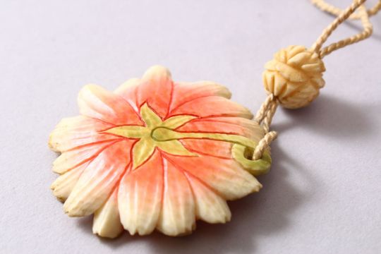 TWO CHINESE 19TH CENTURY CARVED IVORY ITEMS, One necklace carved and stained in floral style, with a small carved bead, the flower 5cm, and one bone carved bead bracelet, open measuring 23cm. (2)