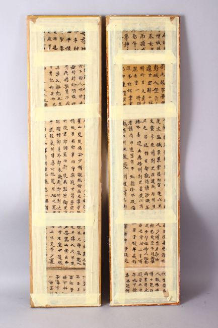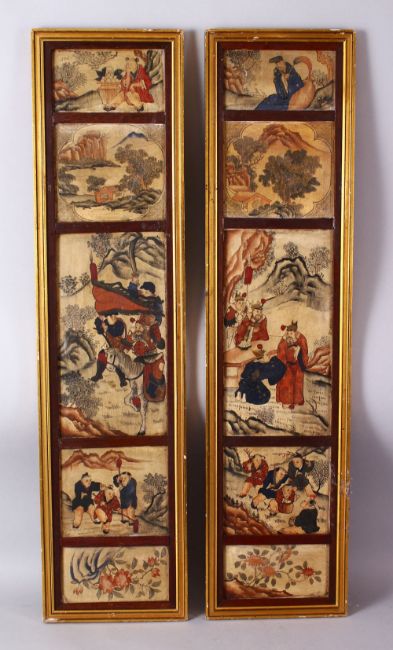 A PAIR OF CHINESE FRAMED PAINTED SOAPSTONE PANELS, each framed section housing five individual painted panels - each depicting scenes of figures, landscapes and flora, the versos of each section with calligraphy, 80cm x 20cm.