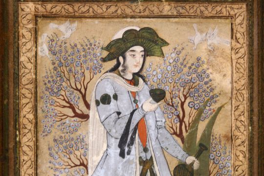 A SAFAVID MINIATURE PAINTING OF A PRINCE in a garden setting, 14cm x 9.5cm.