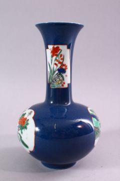 A 19TH / 20TH CENTURY CHINESE POWDER BLUE / FAMILLE VERTE PORCELAIN VASE, with panels of bouquet display, the base with a kanxgi style leaf mark, 19cm high.