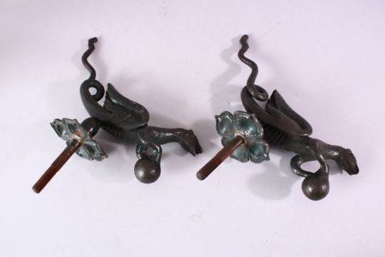 AN UNUSUAL PAIR OF CAST IRON DOOR KNOCKERS, in the form of mythical creatures, both approx. 30cm long.