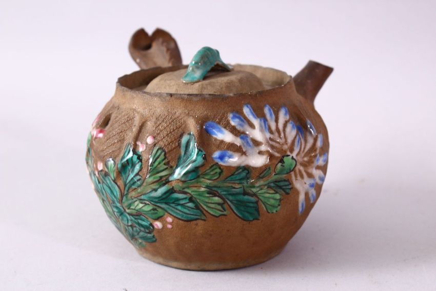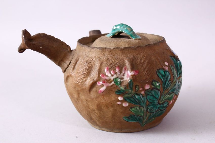 A JAPANESE BANKO STYLE POTTERY ENAMEL TEAPOT, with floral enamel decoration, 15cm.