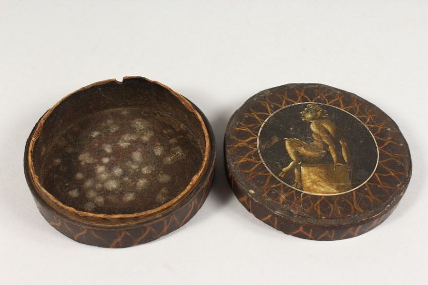 A 18TH CENTURY PAPIER MACHE CIRCULAR BOX, the lid painted with a satyr.