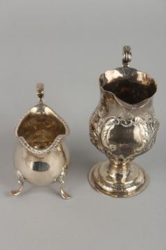 A GEORGE III SILVER HELMET-SHAPED CREAM JUG with repousse decoration, and a small cream jug.