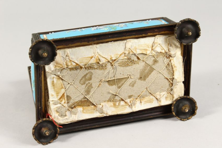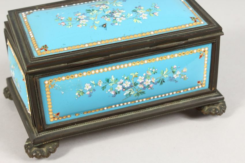 A 19TH CENTURY FRENCH BLUE ENAMEL JEWELLERY BOX, blue ground painted with flowers.