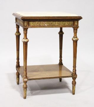 A FRENCH MARBLE TOP TABLE, on fluted legs with under-tier.