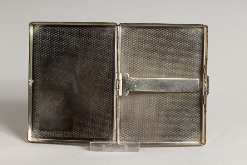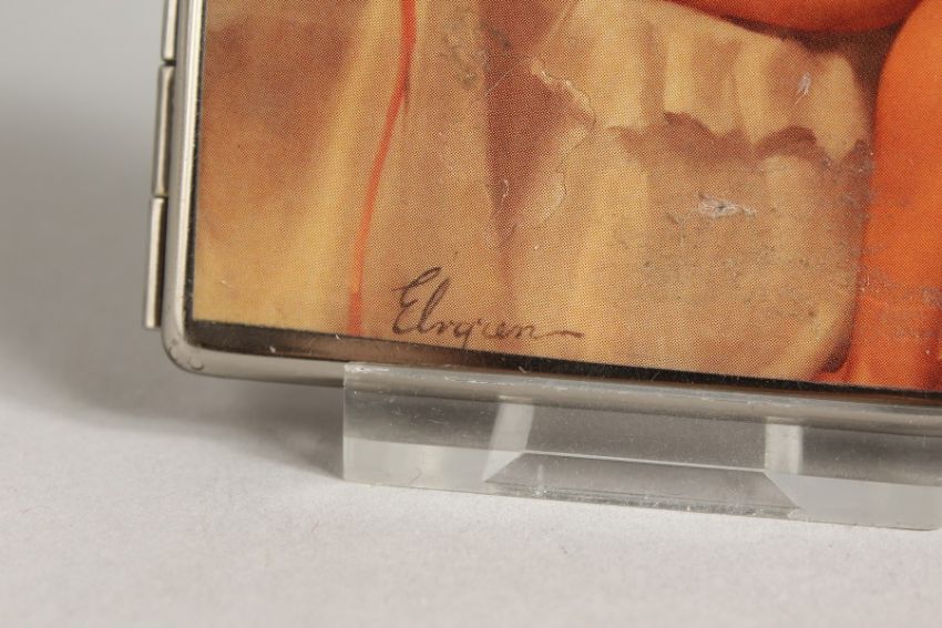 A METAL ENGINE TURNED CIGARETTE CASE. the top with a glamour model, seated nude.