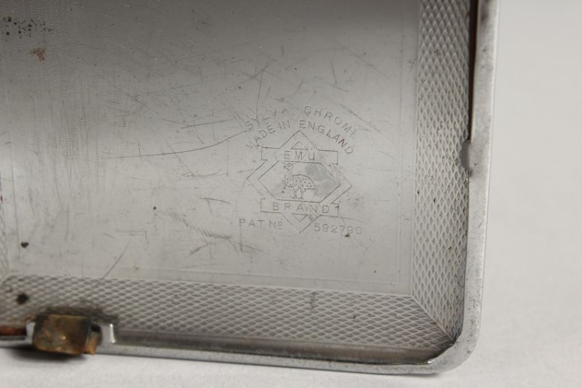 A METAL ENGINE TURNED CIGARETTE CASE. the top with a glamour model, semi-nude.
