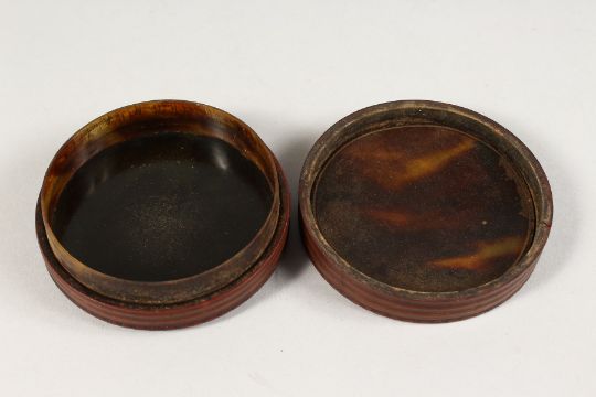 A 19TH CENTURY TORTOISESHELL CIRCULAR BOX, the lid painted with a tavern scene.