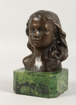 A BRONZE FEMALE HEAD on a marble base.