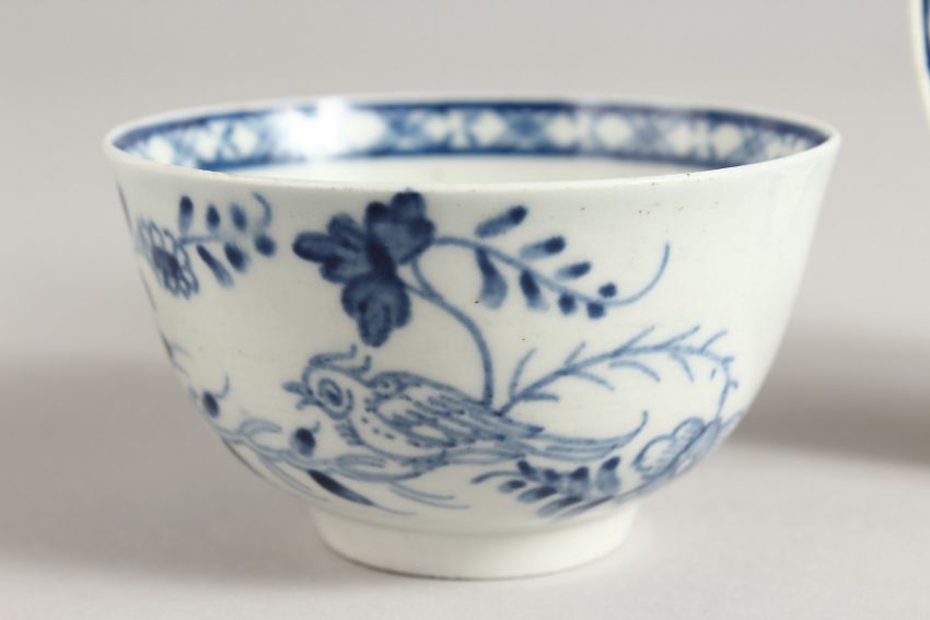 AN 18TH CENTURY LIVERPOOL BLUE AND WHITE TEA BOWL AND SAUCER with bird on a branch.
