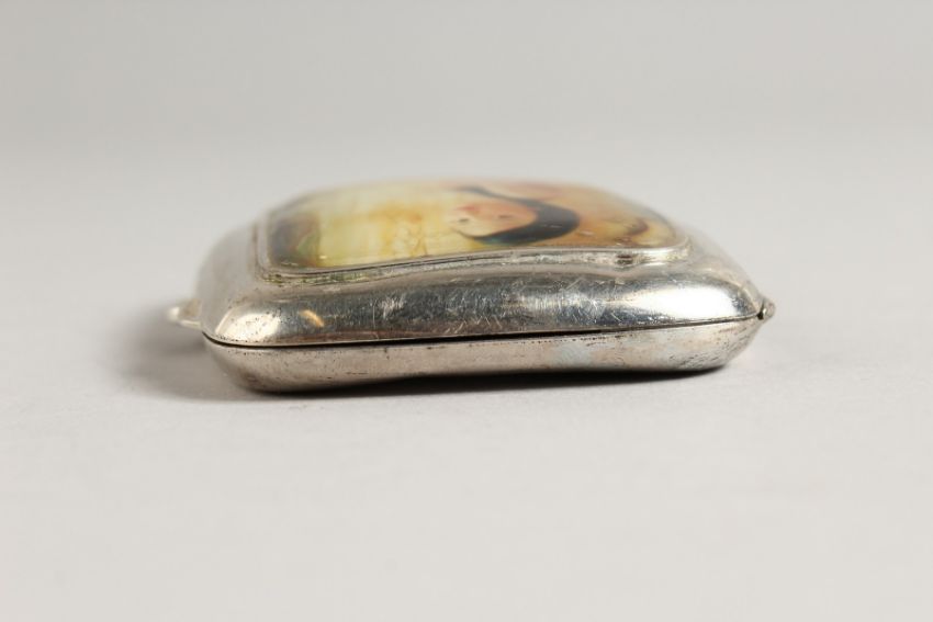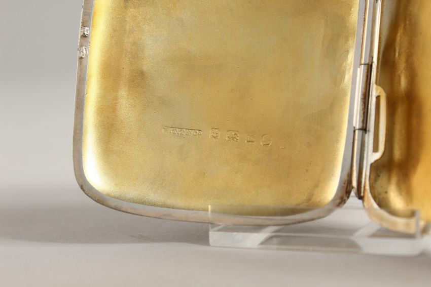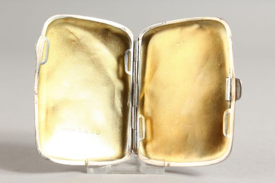 A GEORGE V ENGINE TURNED SILVER CIGARETTE CASE, the top with an enamel of a three-quarter length nude.