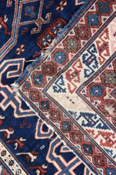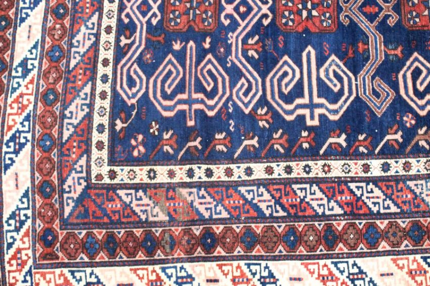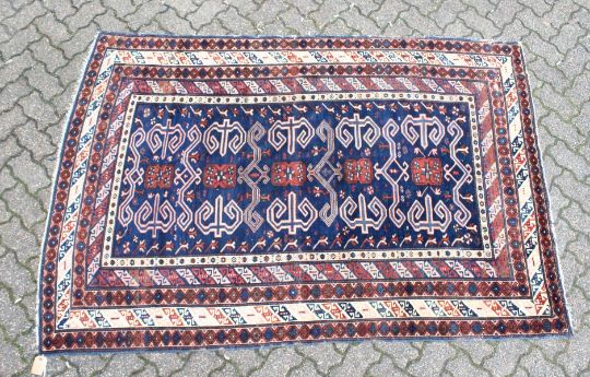A CAUCASIAN RUG, mid 20th century, dark blue ground with stylised decoration within a five row border.