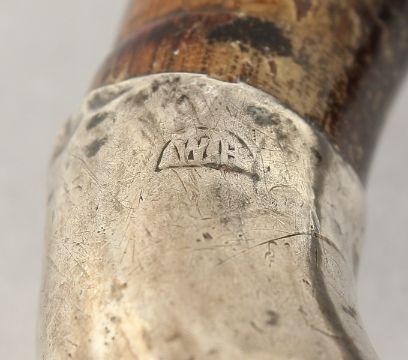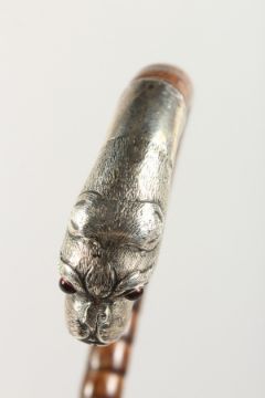 A CANE WALKING STICK with silver BULLDOG HANDLE with glass eyes. 36"